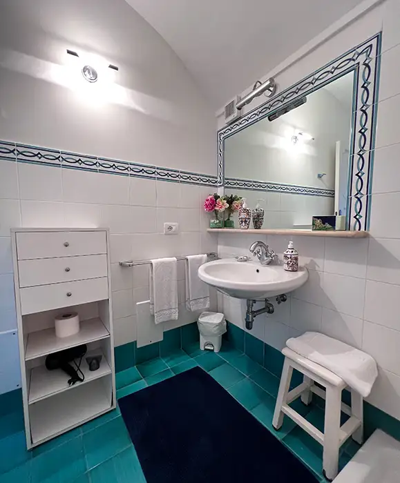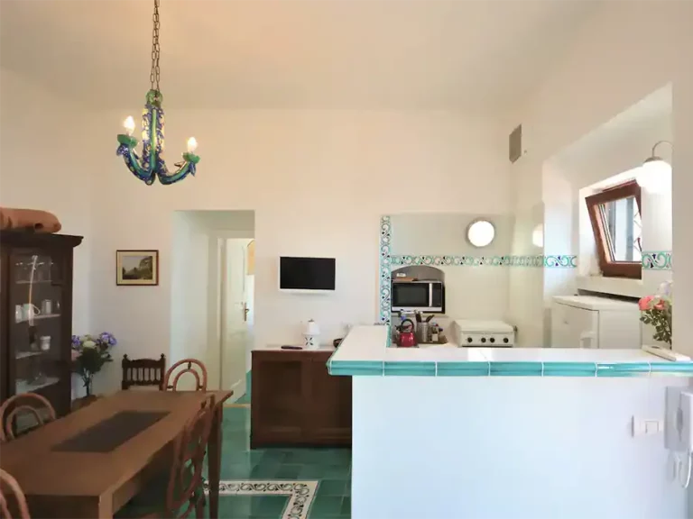 Cavalieri Suite (up to 4+1 guests): 70 sqm internal, plus 90 sqm exclusive terrace and staircase with 50 steps links the garden to the Amalfi-Pogerola road and 30 steps links the garden to the Suite. Two double bedroom, each one has en-suite bathroom with shower (hair-dryer available); the kitchen has a fridge-freezer, a four gas hob stove, sink, MW-oven, dishwasher, washing machine, toaster, kettle, iron and board; the internal cooking/dining room has a table and chairs for 6 people, a showcase for dishes/ glasses, pieces of cutlery; onto the terrace a greenhouse structure with a sitting room and a dining room with cooking facilities available (a two gas hob stove, sink), armchairs, sun umbrella and sun loungers, shower. A sofa bed for an additional single bed is available.